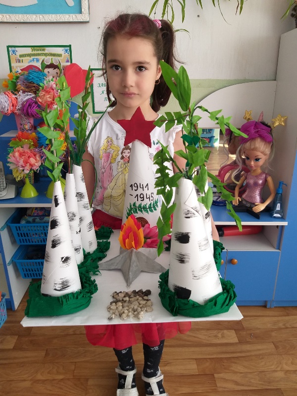 В преддверии Дня Победы в нашем детском саду была организована тематическая выставка рисунков и поделок. Ребята совместно с родителями изобразили картины сражений, Вечный огонь, солдат-освободителей, белых голубей, салют и т.д. В каждом рисунке не просто сюжет – история отдельной семьи, личные переживания и отношение к этому празднику – уважительное, трепетное, со слезами на глазах. Каждая работа выполнена с большой любовью, несёт в себе тепло и доброту.