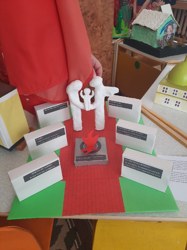 В нашем детском саду в рамках года культурного наследия народов России реализуется проект "Касимов – наш общий дом". Педагоги создали макеты знаковых мест города: площадь Победы, мечеть с минаретом, текие Шах-Али хана, Дворец культуры, мемориал Славы с барельефами героев ВО войны, мемориал, погибшим в локальных конфликтах, сквер им. А.С. Пушкина. Все макеты выполнены в различных техниках из подручных материалов. Данная выставка заняла центральное место в музее ДОУ "Защитники Отечества" и стала излюбленным местом проведения образовательной деятельности и экскурсий.