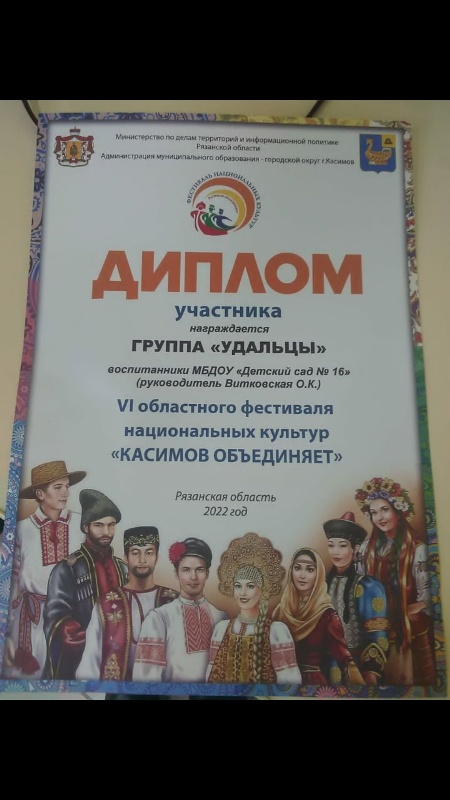 19 ноября в Центре культурного развития прошел VI областной фестиваль национальных культур "Касимов объединяет". На фестивале выступили воспитанницы группы "Удальцы": Карина Джангулова, Валерия Куликова и Маргарита Шибаева. Девочки показали сценку "Две девицы - две красавицы" автора Ольги Витковской, рассказали истории о касимовской невесте Фимушке и татарочке Сююмбике. Воспитанница группы "Ромашка" Дрюнина Варвара прочитала стихотворение "Касимов". Вокальный дуэт "Апрель" в составе Чекулаевой Аделины и Ереминой Ники подготовил песню "Осень золотая".